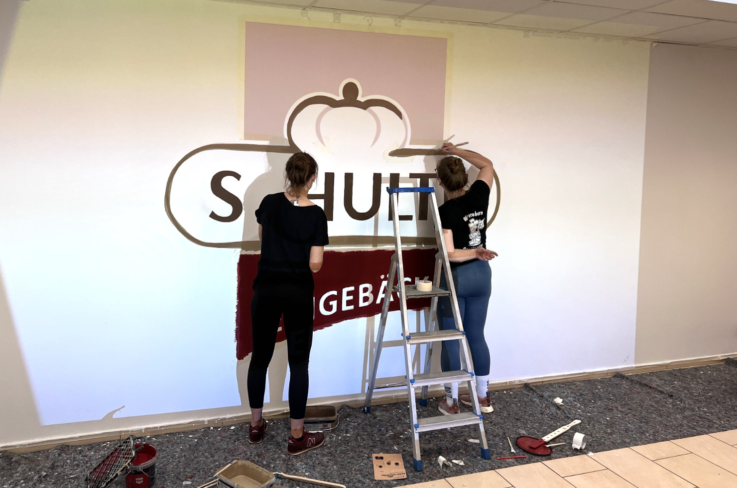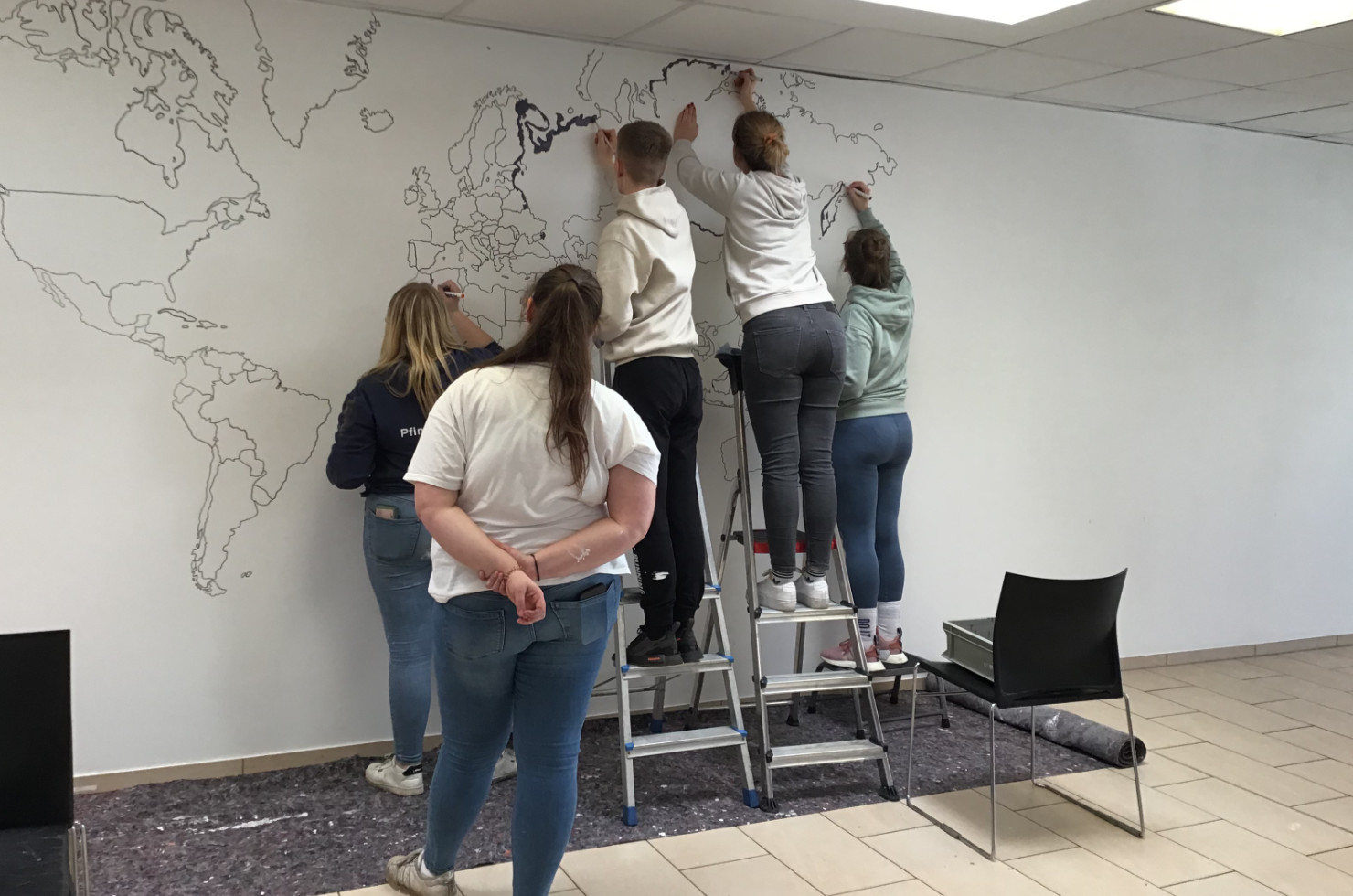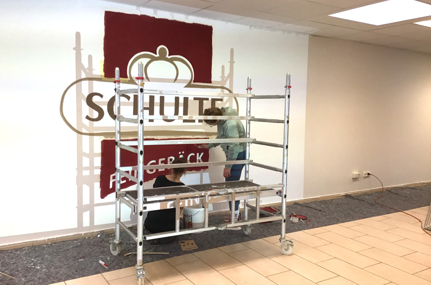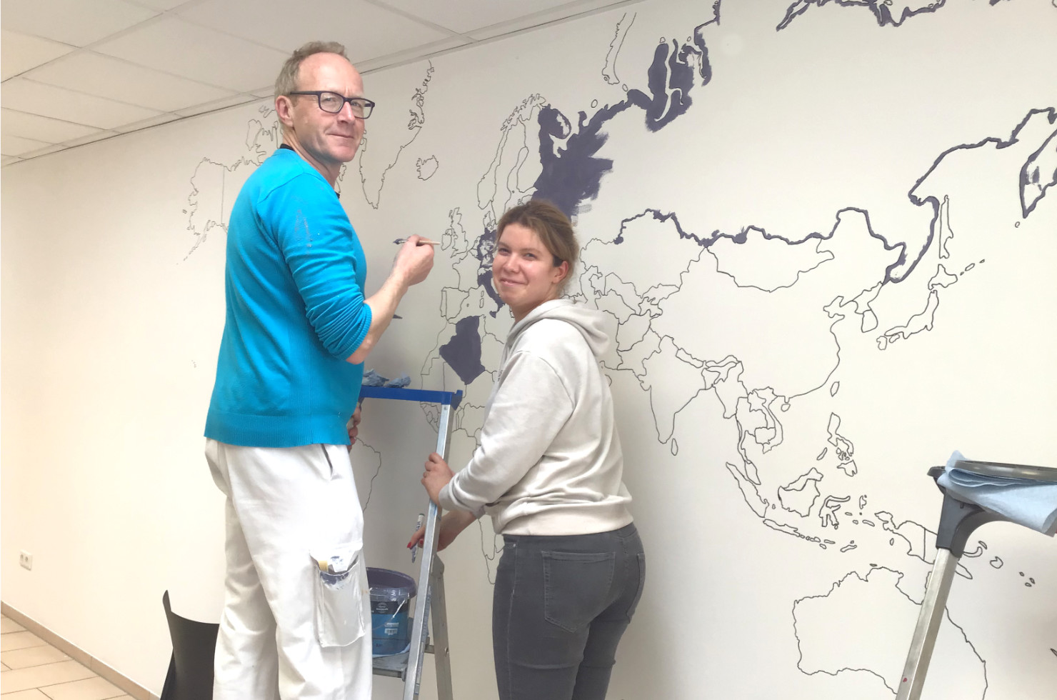 Am Freitag, den 24. März kamen unsere Azubis zu einer nicht alltäglichen aber kreativen Aufgabe zusammen: Der Verschönerung des Pausenraumes. Die Tische wurden neu arrangiert und die weißen Wände erhielten durch fleißige Hände ein großes Schulte-Logo auf der einen und eine Weltkarte auf der anderen Seite des Raumes. Auf der Weltkarte wurden dabei all diejenigen Länder hervorgehoben, aus denen die Mitarbeiter von Schulte stammen. Es sind bereits 25 Länder: