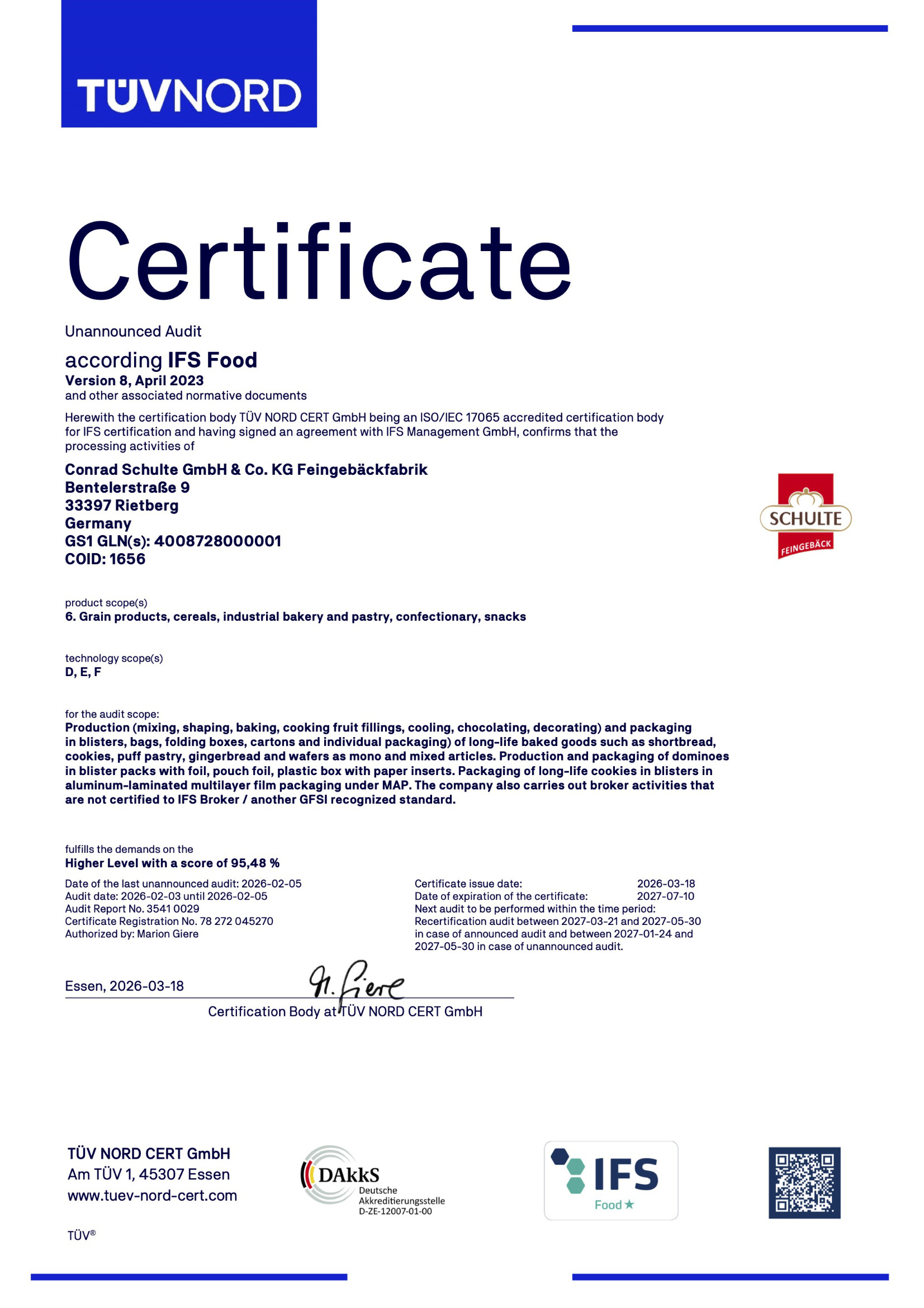 Die Fa. Schulte nimmt am Programm der unangekündigten IFS-Audits teil. Der International Featured Standard (IFS) Food ist ein international anerkannter Qualitätsstandard für Lebensmittel mit dem Schwerpunkt Lebensmittelsicherheit.